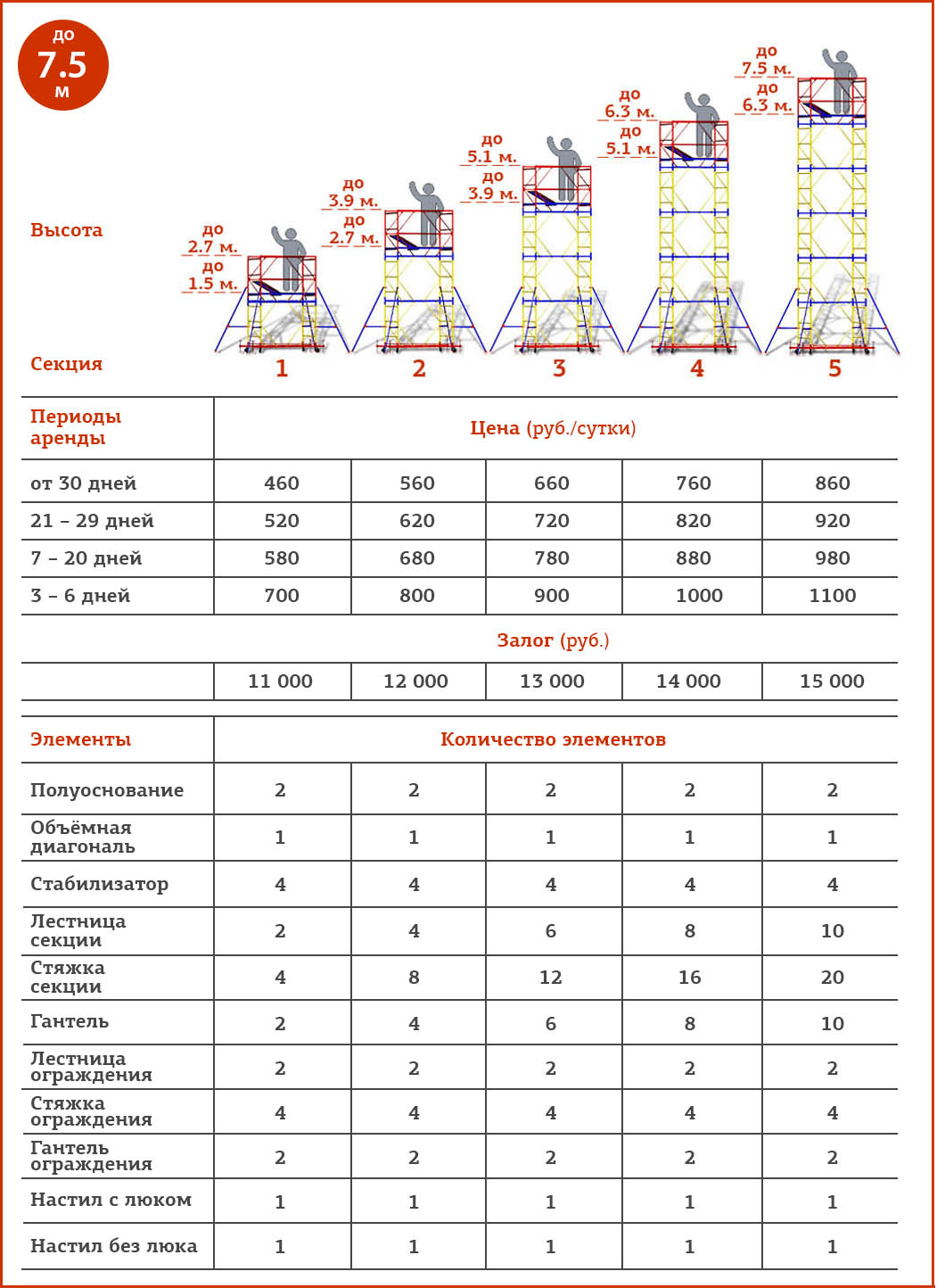 Таблица аренды и залогов за секции, комплектации