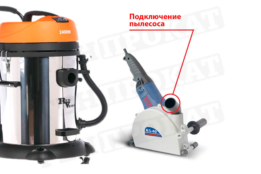 Комплектация штробореза позволяет подключать пылесос для уменьшения пыли и мелких частиц, образующихся при резке камня, бетона и других твердых материалов.